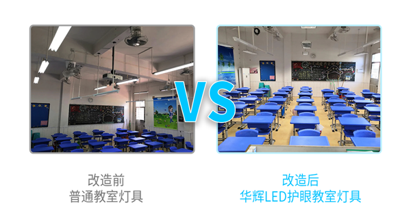华辉照明设计了专门用于教室照明灯具——led护眼教室灯和led护眼黑板灯,符合国家标准课桌维持平均(恒)照度大于300lx,照度均匀度0.7;黑板维持平均(恒)照度500lx,照度均匀度0.8;显色指数大于90,色彩还原性高;采用格栅防眩光设计,眩光值小于16,不刺眼;色温是5000K,舒适柔和;整个教室照度均匀,无频闪,没有蓝光危害。